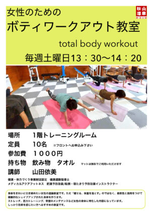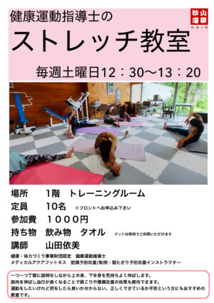 運動をしたいけれど何をしたら良いか分からない、正しくできているか不安という方にもおすすめの教室です。是非レッスンの前後は温泉と組み合わせてお楽しみ下さい。